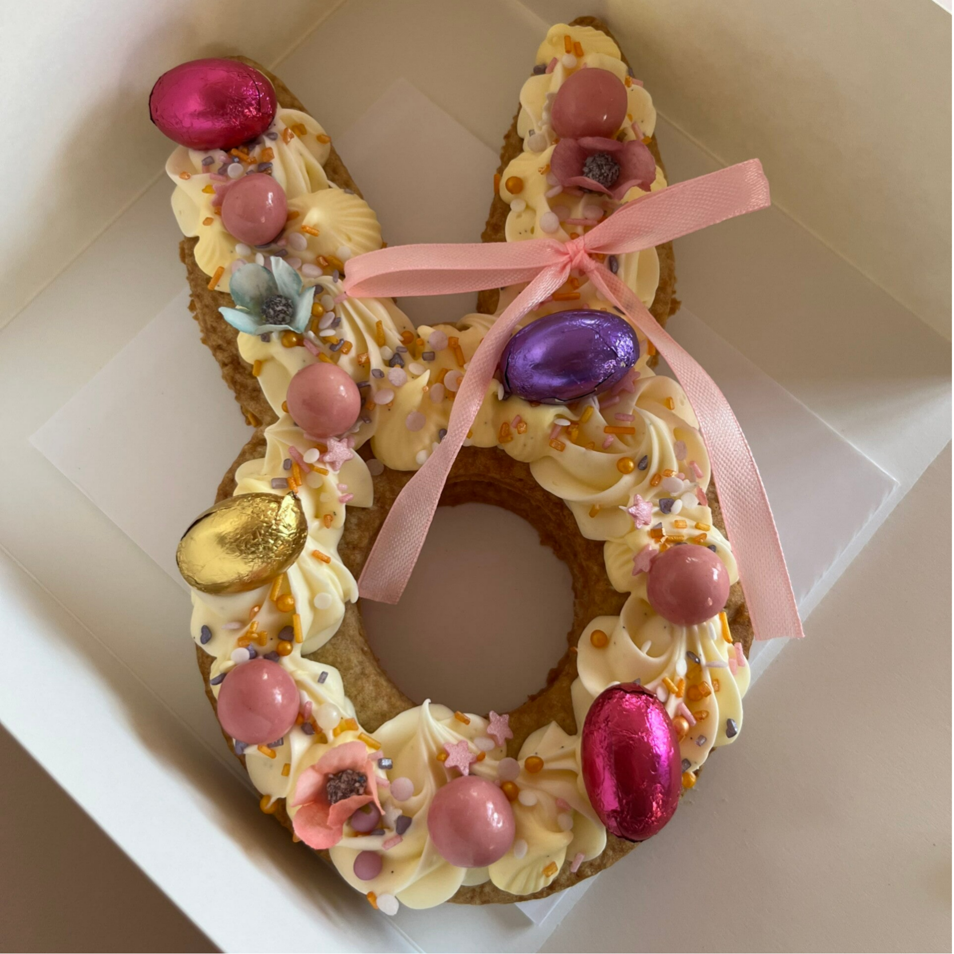 Een schattige paastaart met een krokant amandelboterdeegje en vanille merengue boterroom. Afgewerkt met lekkers